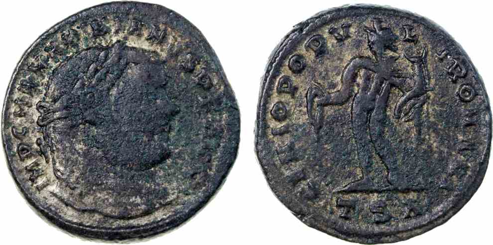 Obv: IMP C M A MAXIMIANVS PF AVG, Laureate head facing right.