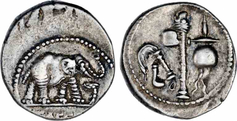 Obv: CAESAR, Elephant walking right trampling on dragon.