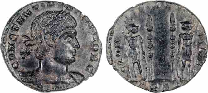 Rev: GLORIA EXERCITVS (TRS* in ex.), Two soldiers, helmeted, draped, cuirassed, standing facing each other, each holding spear in outer hand and resting inner hand on shield; between them, two standards.