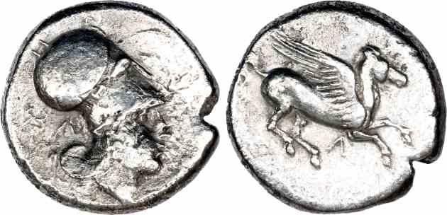 Rev: Head of Athena right wearing Corinthian helmet.