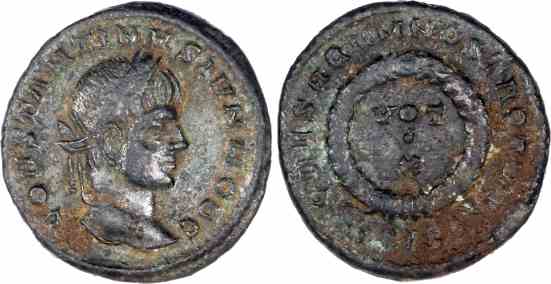 Rev: CAESARVM NOSTRORVM (ASIS* in ex.), VOT X within a laurel wreath.