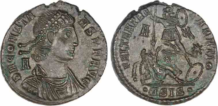 Rev: FEL TEMP REPARATIO (᛫ASIS᛫ in ex.), Soldier spearing fallen horseman wearing shield, shield on ground to right; horseman wearing a pointed cap.