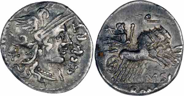 Silver denarius, 19mm, 3.87gm, issued 116/115 BC Rome mint.
