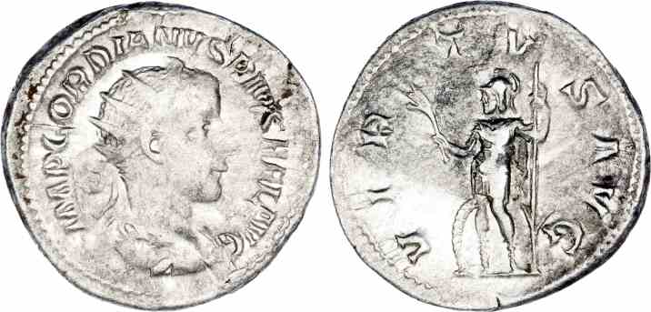 Obv: IMP GORDIANVS PIVS FEL AVG, Radiate, draped, cuirassed bust right.