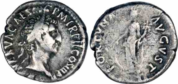 Rev: FORTVNA AVGVST, Fortuna, draped, standing left, holding rudder set on ground in right hand and cornucopiae in left.
