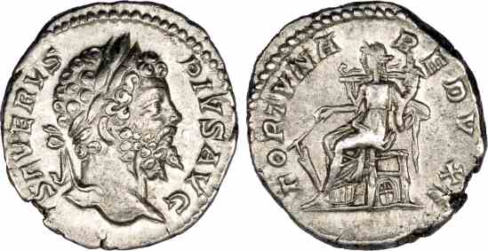 Rev: FORTVNA REDVCI, Fortuna, draped, seated left on low seat, holding rudder set on globe in right hand and cornucopiae in left hand.
