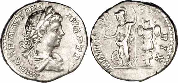 Rev: MINER VICTRIX, Minerva, helmeted, draped, standing left, holding Victory and spear; at feet, shield; trophy behind.