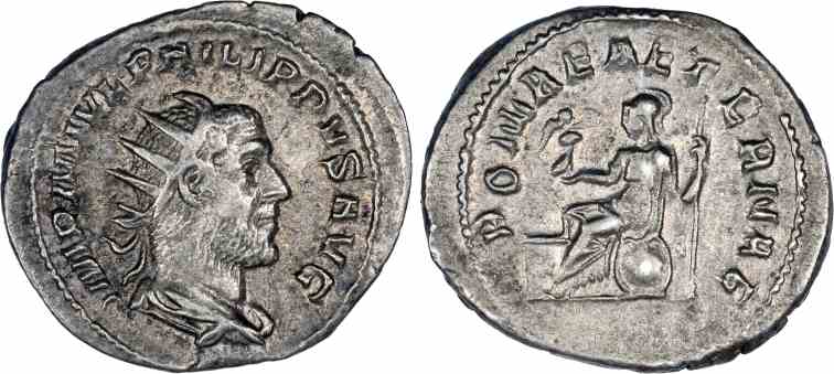 Obv: IMP M IVL PHILIPPVS AVG, Radiate, draped, cuirassed bust right.