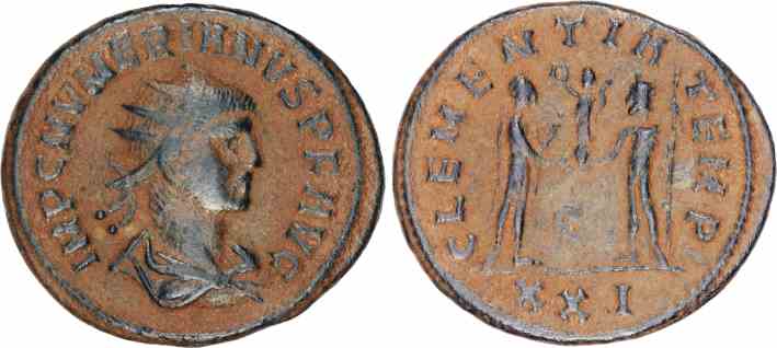 Rev: CLEMENTIA TEMP, Numerian, draped, cuirassed, standing right, holding sceptre and receiving Victory on globe from Jupiter (or Carus), standing left, holding sceptre.