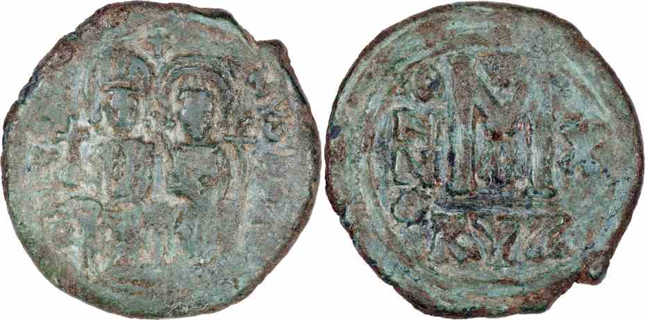Bronze follis, 30mm, 12.60gm, issued AD 574/575 Cyzicus mint.