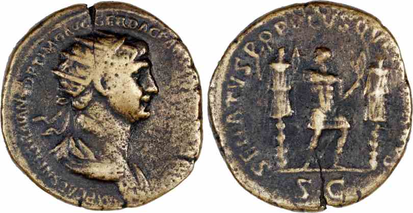 Rev: SENATVS POPVLVSQVE ROMANVS (SC in ex.), Trajan, in military dress, standing front, head left, striding between two trophies.