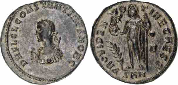 Obv: DN FL CL CONSTANTINVS NOB C, Laureate, draped bust left, holding sceptre and mappa.