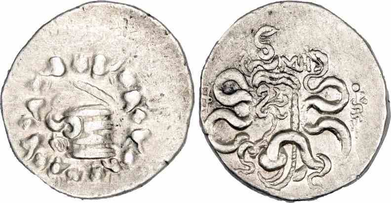 Obv: Cista mystica containing serpent, all within ivy wreath, rev..