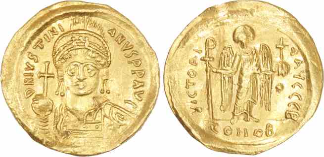Gold solidus, 21mm, 4.50gm, issued AD 545-565 Constantinople mint.