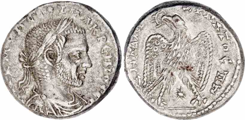Rev: ΔHMAΡΞ EX YΠATOC ΠΠ, Eagle stg, head left, with wings spread, holding wreath in beak; star between legs..