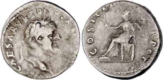 Silver denarius, 17mm, 3.17gm, issued AD 70 Rome mint.