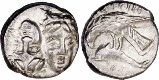 Obv: Two young male heads facing, side by side, left inverted.