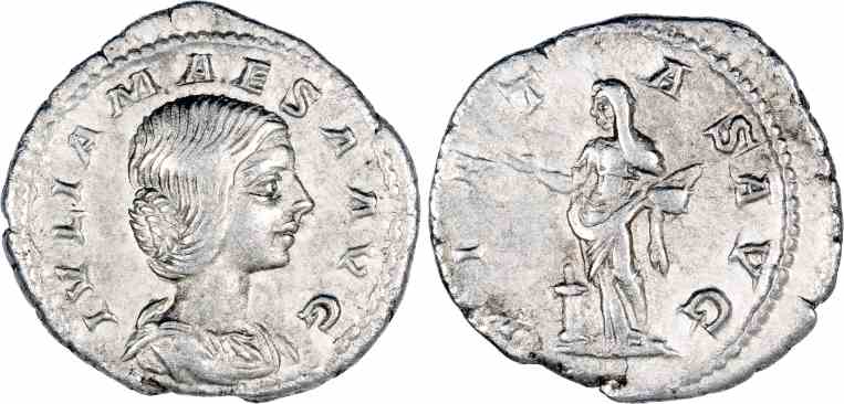 Obv: IVLIA MAESA AVG, Bust with hair waved and turned up low at the back, draped, right.
