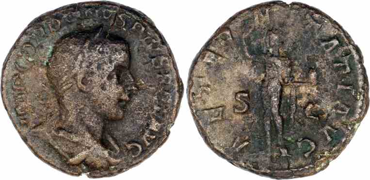 Obv: IMP GORDIANVS PIVS FEL AVG, Laureate, draped, cuirassed bust right.
