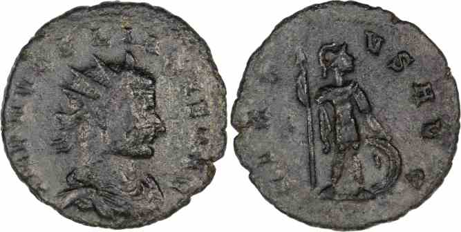 Rev: VIRTVS AVG, Virtus, helmeted, in military attire, standing right, holding spear and resting on shield.