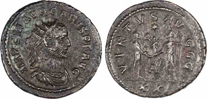 Rev: VIRTVS AVGGG, Carus, draped, cuirassed, standing right, holding parazonium and receiving Victory on globe from Jupiter (or Carinus or Numerian) standing left, holding sceptre.