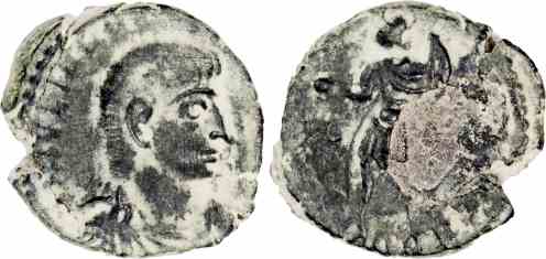 Rev: SPES REI PVBLICE (CONS in ex.), Julian, helmeted, draped, cuirassed, standing left, holding globe in right hand and spear in left hand.