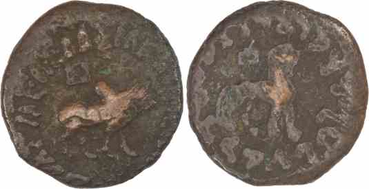 Obv: BAΣIΛEΩΣ BAΣIΛEΩN MEΓAΛOY AZOY, Bull standing right.