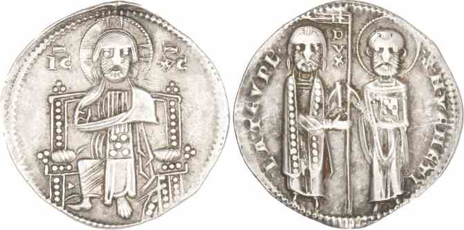 Rev: •LA TEVPL•DVX S M•VENETI, Doge and St. Mark standing facing, holding banner between them.
