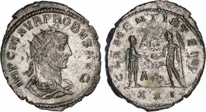 Rev: CLEMENTIA TEMP (XXI in ex.), Probus, standing right, holding sceptre, receiving globe from Jupiter holding sceptre, A᛫ between.