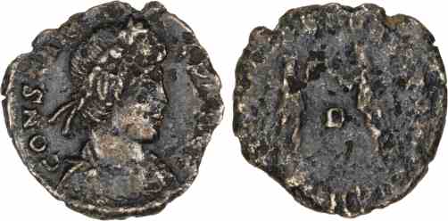 Obv: CONSTANS PF AVG, Bust of Constans, rosette-diademed, draped, cuirassed, right.