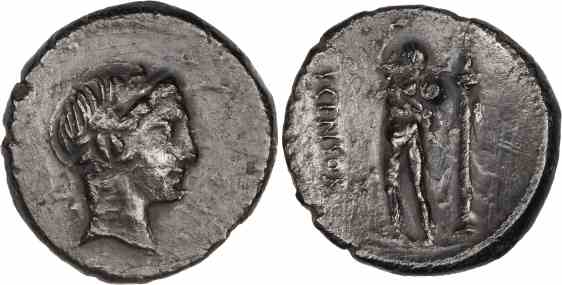 Rev: L.CENSOR, Marsyas, bald-headed, walking left, with right arm raised and holding wine-skin over left shoulder; behind, column bearing statue of Victory.