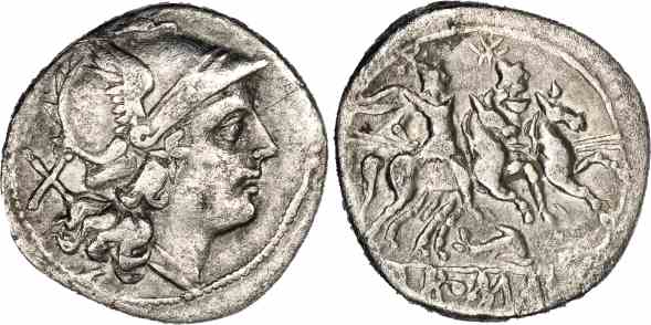 Rev: ROMA, Dioscuri galloping right. Dolphin below.