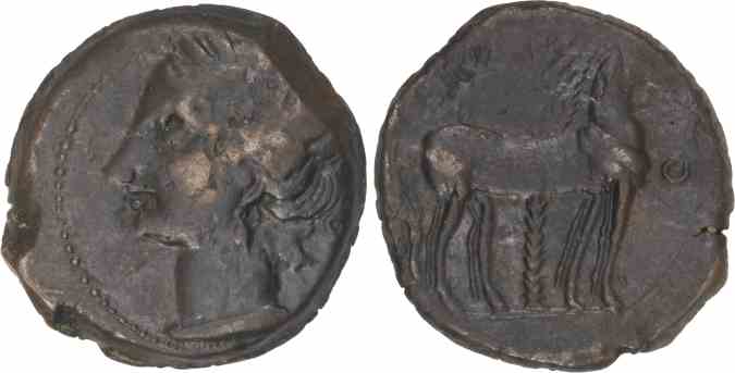 Rev: Horse standing right, palm tree behind, punic letter to right.