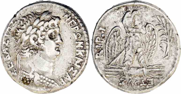 Obv: NEPΩN KAIΣAPΣ ΣEBAΣTOΣ, Laureate bust right wearing aegis.
