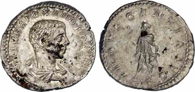 Very rare issue of Severus Alexander as Caesar for a short period at the end of the reign of Elagabalus.