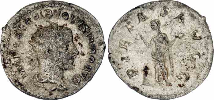 Obv: IMP CAE C VIB VOLVSIANO AVG, Radiate, draped, cuirassed bust right.