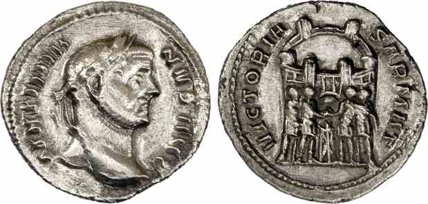 Rev: VICTORIA SARMAT, Tetrarchs sacrificing over tripod; behind, archway in an eight-turreted enclosure.