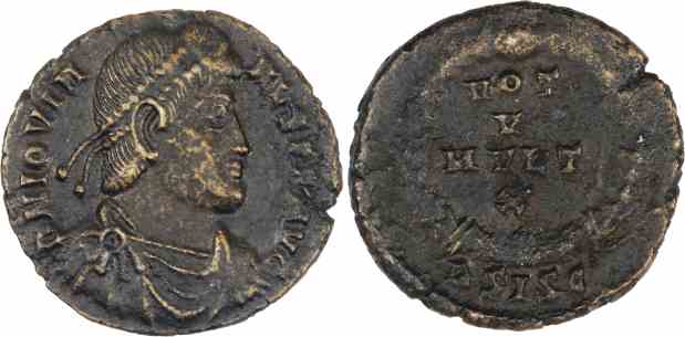 Obv: DN IOVIANVS PF AVG, Bust of Jovian, pearl-diademed, draped, cuirassed, right.